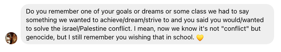 In my last newsletter, I said that in 2007, it was Palestine that radicalised me. It was the first political issue that made me go out into the streets and protest. Occupy a building, pick up a megaphone, put my body on the line. It changed me.